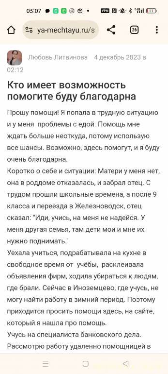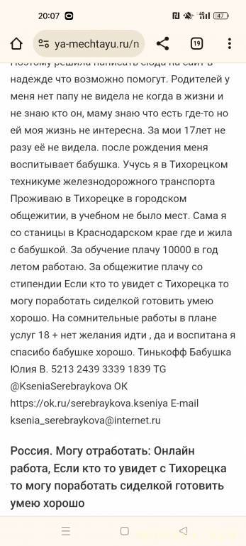 ksenia_serebraykova: 30 ноя 2023, 19:47 Прошу помогите на еду продукты или онлайн какой то работой.Сейчас у меня критическая ситуация работы подработки нет уже продолжительное время ,обещают скоро заказы но как скоро не понятно.Дома толком уже не чего нет, продала уже какие были ненужные вещи акксесуары.Счас нет даже на хлеб уже несколько дней. Бабушку просить не о чем не хочу, я вижу как она с трудом перебиваеться на свою пенсию маленькую, она и так меня на неё вырастила.Поэтому решила написать сюда на сайт в надежде что возможно помогут.Родителей у меня нет папу не видела не когда в жизни и не знаю кто он, маму знаю что есть где-то но ей моя жизнь не интересна.За мои 17лет не разу её не видела. после рождения меня воспитывает бабушка. Учусь я в Тихорецком техникуме железнодорожного транспорта