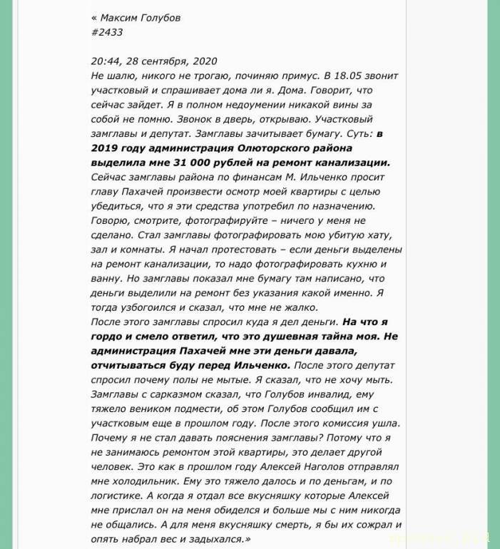 Вы подтверждаете что незаконно собирали информацию о Голубове и лица перечисленные вами ее вам предоставляли?Ahtunen: 07 сен 2024, 10:15 Да неужели?у меня есть ответы главы администрации,замглавы, директора школы и,можешь прийти и уточнить у них они ли это отвечали Ответы других жителей,что пытались помочь,работу сторожем давали,только отказался Голубов,не по чину ему
