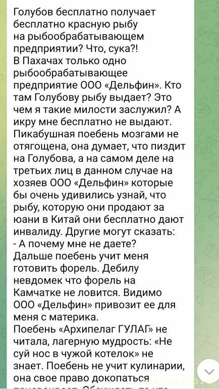 Пикабушная поебень мозгами не отягощена, она думает, что пиздит на Голубова, а на самом деле на третьих лиц в данном случае на хозяев ООО «Дельфин» которые бы очень удивились узнай, что рыбу, которую они продают за юани в Китай они бесплатно дают инвалиду. Другие могут сказать: