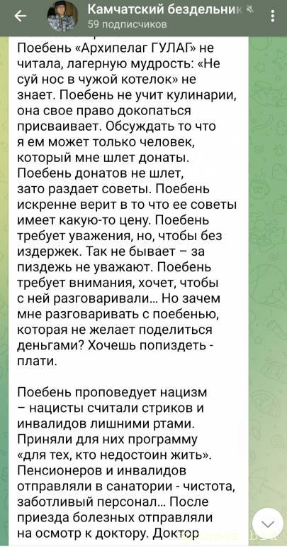 В заключение обращусь к читателям: мразь ссыт вам в уши уверенная в том, что вы промолчите. Некоторые решат, что это забавно читать. Это не забавно. Почему мразь до меня докапывается? Потому что я описываю свою жизнь и сколько стоят продукты на севере Камчатки. Оспорить это невозможно, поэтому работодатели ботов поставили задачу путем клеветы заставить меня заткнуться или как минимум чтобы у вас появились сомнения. Я не прошу чтобы вы верили мне как товарищу Сталину, я прошу чтобы вы требовали от ботов документальных доказательств их утверждений. Будете молчать, кто знает может и вам придется писать в соцсетях о своих проблемах, тогда на вас натравят эту свору. Им все равно на кого клеветать лишь бы деньги платили. (С)
