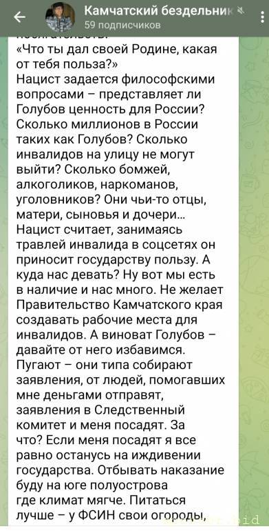 Нацист задается философскими вопросами – представляет ли Голубов ценность для России? Сколько миллионов в России таких как Голубов? Сколько инвалидов на улицу не могут выйти? Сколько бомжей, алкоголиков, наркоманов, уголовников? Они чьи-то отцы, матери, сыновья и дочери… Нацист считает, занимаясь травлей инвалида в соцсетях он приносит государству пользу. А куда нас девать? Ну вот мы есть в наличие и нас много. Не желает Правительство Камчатского края создавать рабочие места для инвалидов. А виноват Голубов – давайте от него избавимся.