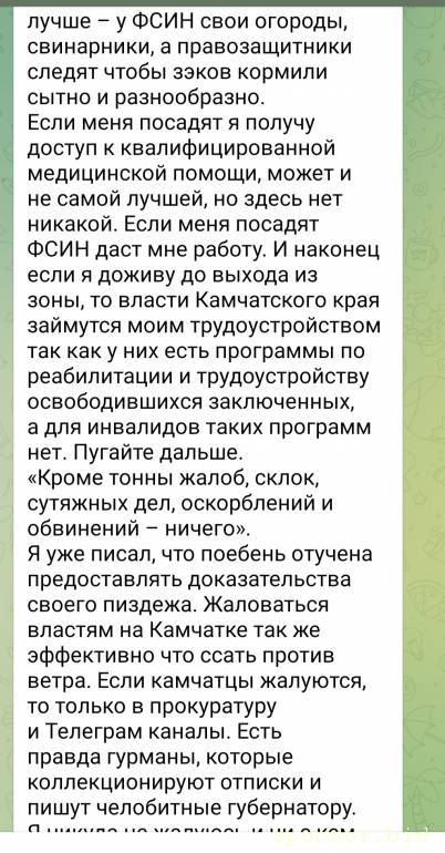 Пугают – они типа собирают заявления, от людей, помогавших мне деньгами отправят, заявления в Следственный комитет и меня посадят. За что? Если меня посадят я все равно останусь на иждивении государства. Отбывать наказание буду на юге полуострова где климат мягче. Питаться лучше – у ФСИН свои огороды, свинарники, а правозащитники следят чтобы зэков кормили сытно и разнообразно. Если меня посадят я получу доступ к квалифицированной медицинской помощи, может и не самой лучшей, но здесь нет никакой. Если меня посадят ФСИН даст мне работу. И наконец если я доживу до выхода из зоны, то власти Камчатского края займутся моим трудоустройством так как у них есть программы по реабилитации и трудоустройству освободившихся заключенных, а для инвалидов таких программ нет. Пугайте дальше.