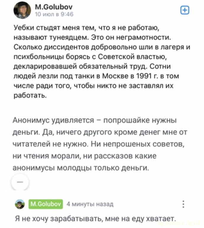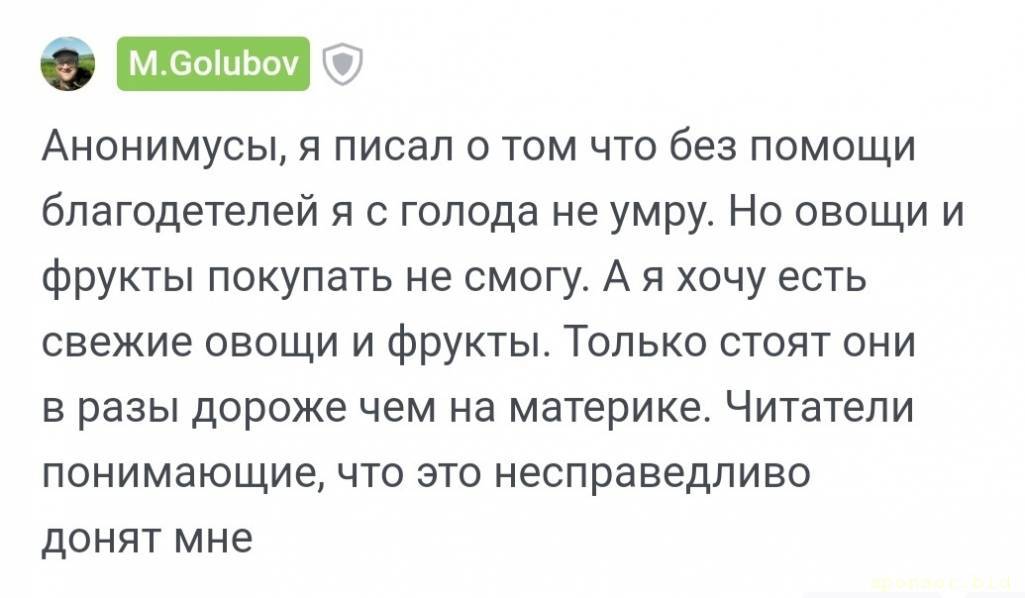 С его точкой зрения по поводу обязательного труда можно поспорить (я как бы, тоже считаю, что нельзя силой заставлять трудиться). Но я убеждена, что тот, кто добровольно (!) выбрал не работать, а сидеть на шее у налогоплательщиков (у меня, в том числе), не должен есть никакие "овощи и фрукты". Только минимальную пайку, чтобы не умереть от голода. Не должен такой человек жить так же, как любой работающий. Он должен жить намного хуже любого низкооплачиваемого работающего. И это справедливо.Топотушка: 05 окт 2024, 23:18 Максим Александрович как обычно привирает. Ещë недавно он утверждал, что ни в чëм не нуждается, пенсии и выплат вполне хватает, чтобы не работать, а сидеть дома и бить баклуши. И заявлял, что "лучше за рубль лежать, чем за два бежать".