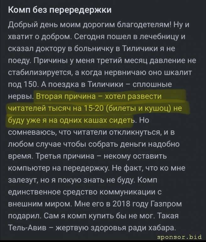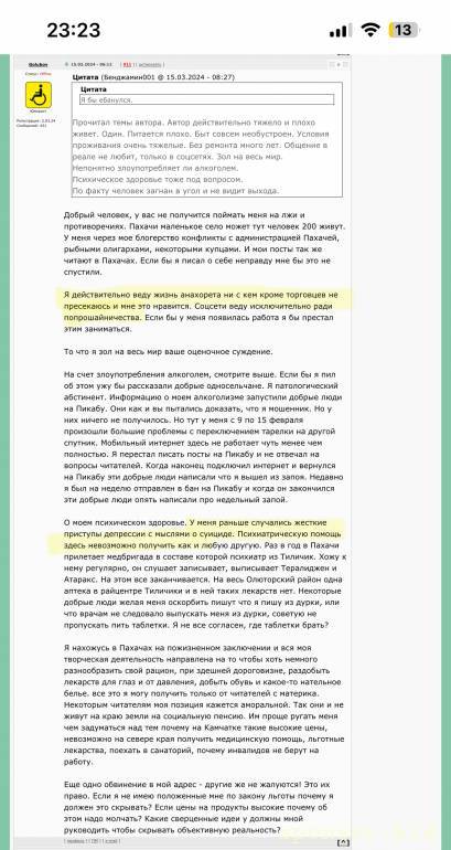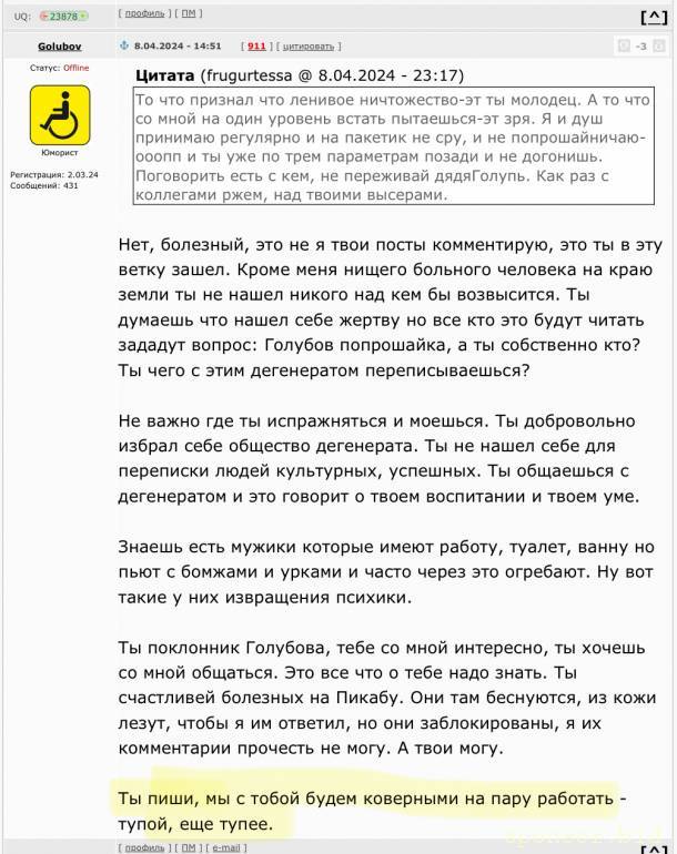 Вы, здоровый, дееспособный мужик, распространили свои призывы о материальной помощи вам, по всем просторам инета. Вам вообще не стыдно? Чисто риторический вопрос)M.Golubov: 21 окт 2024, 12:26 Ты не ответил на вопрос - зачем ваша украинская группа докапывается до инвалида с Камчатки?