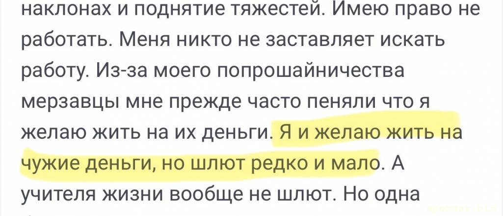 Абсолютно верно.OlesyaS.: 21 окт 2024, 11:46 Потому что вы, здоровый и работоспособный мужик, желаете жить на мои и иные, чужие деньги