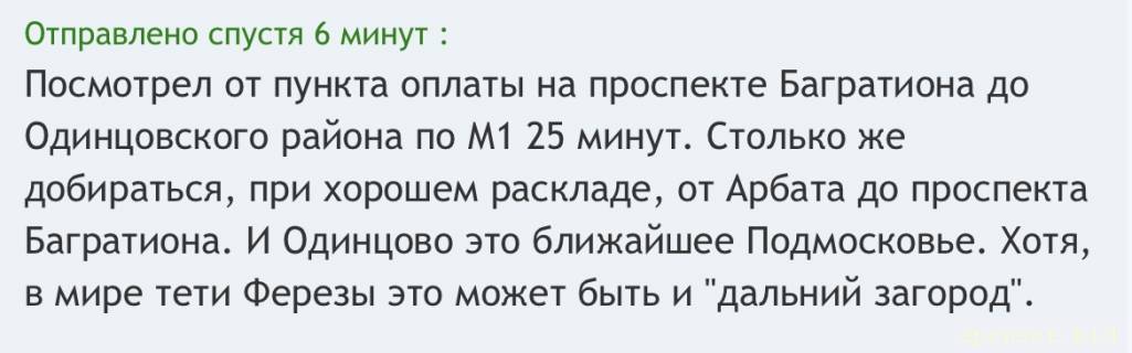 Разумеется, сам Одинцовский район начинается сразу за МКАД. Район большой. Звенигород, находящийся за бетонкой, тоже туда входит. Туда за 40 минут я не доберусь, а до Павловской Слободы по Новорижскому шоссе, например, вполне могу. Без всяких даже платных дорог.