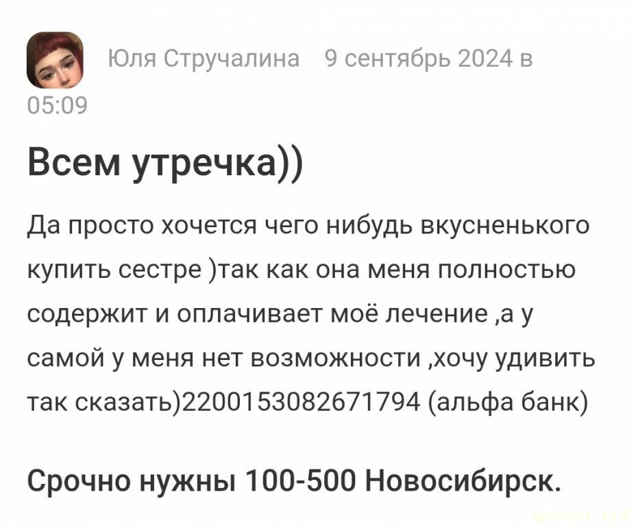 Вранье на вранье:yulya.struchalina: 09 сен 2024, 11:01 Я не совсем бомж ,у меня на обычные продукты есть деньги ,но что случилось того не миновать ,живя с мамой алквшом и папочкой всю жизнь конечно наблюдались,но сейчас когда мне 24 я очень устала ведь когда нам исполнилось 18 все их долги за квартиру упали и на нас поэтому каждую мою зп с меня дерут пол суммы на 15 тыс выжить можно но сложно ,поэтому если тут реально помогают я буду признательна !2200153082671794