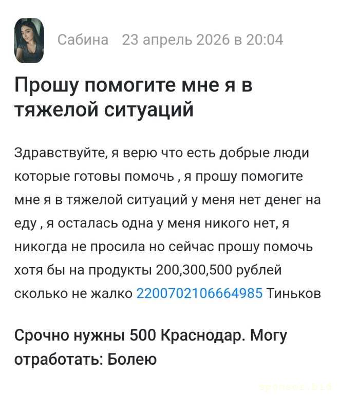 Здравствуйте, я в очень тяжелой ситуаций , прошу помогите муж бросил с ребенком забрал все средства , нахожусь в кавказской республике , хочу уехать на родину нужны билеты мне и ребенку прошу помогите мне некому помочь 2200702106664985 Тиньков , спасибо всем кто поможет
