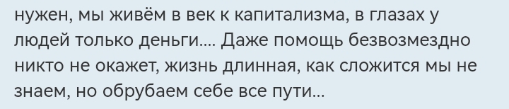 Так что автор, по-разному ситуации складываются, не нужно писать, что нужд-ся никто не помогает и что люди черствые, скорее нужд-ся (сетевым просителям) нефинансовая помощь попросту не нужна!