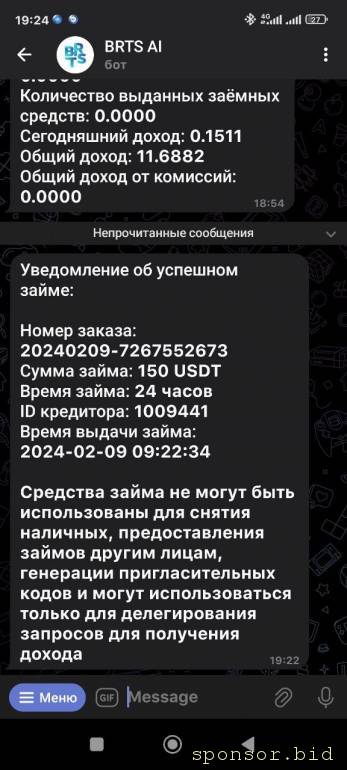 Всем здравствуйте.Ищу инвестиции для проекта под названием brts ai.Сам проект имеет лицензии в америке.Вся суть проекта заключается в том,что проект даёт возможность инвестировать деньги и каждые 4 часа открывать внутри ордера,которые приносят всегда прибыль от 0.6% до 2%.Попал в этот проект через рекламу вконтакте в начале января,после регистрации человек который меня пригласил выдал мне займ на 150$ на 48 часов.За 48 часов я открыл 11 ордеров и заработал около 11$.Вывод от 1 $ на криптовалюту ,вывод опробовал всё работает.Имеется реферальная система трех уровневая, в вложениях прикрепляю условия.По моему проект очень перспективный,за группой слежу уже почти 2 месяца,все работают.Если здесь не отвечаю пишите пожалуйста в телеграмм @Apcent007.