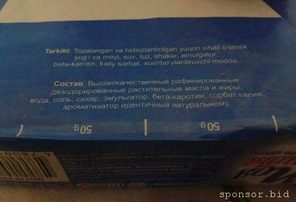 Но вот если искать маргарин, лучше обратить внимание на баночки. На пачках редко будет на узбекском. Вот на баночках вроде было.