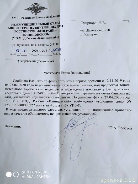 Здравствуйте! Как здорово, что есть сайт, где можно попросить о помощи. Появилась надежда и у меня. Я мама двоих детей. Дочери 12 лет, сыну 14,сын инвалид. Воспитываю одна. Работаю медсестрой. В ноябре 2019 г. меня угораздило связаться с брокерской компанией. Предложили заработать на финансовом рынке на разнице цен продажи доллара, биткоина, акций на нефть и т. д.. Вложила кредиты, одалживала у родных, друзей, давали не только наличные, но и брали кредиты для меня. В итоге должна банкам, родным и друзьям.В феврале 2020 г. обратилась в полицию. Завели уголовное дело и приостановили за не установлением личности мошенников. Жизнь превратилась в сплошные звонки, угрозы, преследования.Кредиты не плачу,один кредит взят под мою долю.Очень боюсь за жильë. Зарплату, пенсию ребëнка отдаю за долги, но на всех не хватает. Существуем на мою пенсию. Долги не уменьшаются, а растут. Я в панике, дети не понимают, что произошло. Страшно жить. Сына везти в Брянск на консультацию по поводу оперативного лечения в феврале месяце. Банк трижды снял деньги, не успела перевести на другую карту. Не получилось и за квартиру заплатить. А 18.02.21 заблокировал карты. Месяц без денег ,это голод и слëзы, стыдно перед детьми очень. У дочери лопнула подошва в осенних полу сапожках, благо что школа рядом, ноги не успевают замëрзнуть, зимние купить не получается. И сын прислал фото кроссовок, расклеились. Что дальше делать не знаю, понимаю слезами горю не поможешь, а плачу я по ночам, не могу при дочери. Сын живëт не с нами, учится в школе-интернат,в другом городе, но его здоровьем занимаюсь я. На каникулах забираю домой и когда заболеет. Год живу в стрессовом состоянии, ради детей держусь,силы наисходе. Из этой пропасти одной не выбраться.Богатые господа, добрые и сострадательные люди,спасите меня! Помогите исправить всë это! Доказательства все есть.