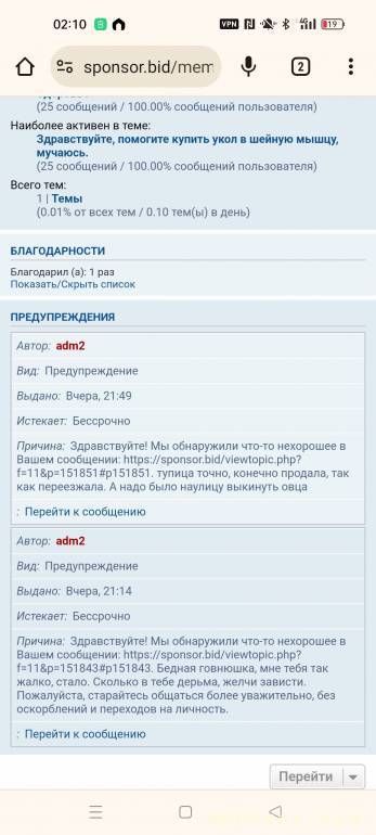 мне предупреждениеПавел Валерьевич: 20 дек 2023, 21:28 что-то админ перестал адекватно реагировать на жалобы. "нуждающаяся" оскорбила участников неоднократно, админ заходит на форум, но не блокирует. любой постоянный участник давно бы уже был покаран за подобное)