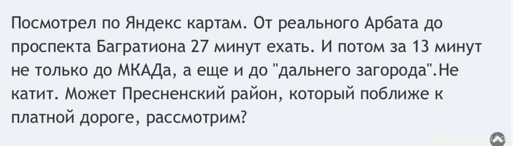 Посмотрел по Яндекс картам. От реального Арбата до проспекта Багратиона 27 минут ехать. И потом за 13 минут не только до МКАДа, а еще и до "дальнего загорода".Не катит. Может Пресненский район, который поближе к платной дороге, рассмотрим?Mathilda: 08 фев 2024, 12:50 Как пожелаете, мне пофиг. Берём условный Арбат, выезжаем на Кутузовский проспект и сворачиваем на проспект Багратиона, далее от МКАДа по М1. Я и вчера так сделала. Вам лень скачать навигатор или что? Пристал, как банный лист, с одним и тем же вопросом.