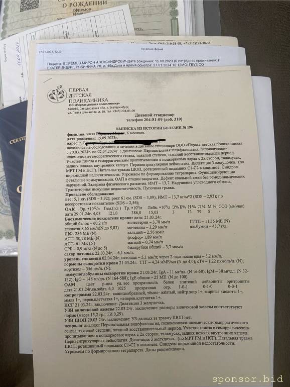Добрый день! Меня зовут Ксюша, мне 22 года. Совсем недавно я стала мамой, моему ребенку 10 месяцев. К сожалению случилось так, что врачи допустили большую ошибку, и у ребенка была тяжелая гипоксия, буквально родился мертвым. Сейчас же у нас постоянные реабилитации, мне очень жаль, что мой ребенок по чьей то ошибке не может радоваться детству, а должен страдать и мучатся за каждое движение, добиваться и бороться, чтобы догнать сверстников. Каждые 2 недели дорогостоящие для нас с сыном занятия: бассейн, Войта терапия, Бобат терапия, ЛФК, иглоукалывания. Сейчас впереди самая важная реабилитация, но к сожалению я одна не могу вытянуть, так как это очень дорого. Занимаюсь и оплачиваю я все сама. Я мечтаю чтобы мы с ребенком за руку вместе гуляли. Хотела бы выложить все выписки, но там видно персональные данные.