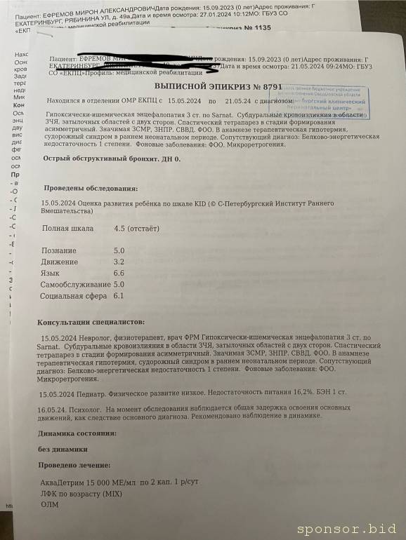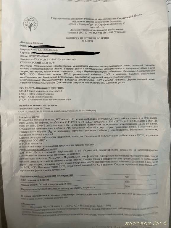 Обратитесь в благотворительные фонды помощи больным деткам.Ксения_Мир: 01 авг 2024, 23:05 Добрый день! Меня зовут Ксюша, мне 22 года. Совсем недавно я стала мамой, моему ребенку 10 месяцев. К сожалению случилось так, что врачи допустили большую ошибку, и у ребенка была тяжелая гипоксия, буквально родился мертвым. Сейчас же у нас постоянные реабилитации, мне очень жаль, что мой ребенок по чьей то ошибке не может радоваться детству, а должен страдать и мучатся за каждое движение, добиваться и бороться, чтобы догнать сверстников. Каждые 2 недели дорогостоящие для нас с сыном занятия: бассейн, Войта терапия, Бобат терапия, ЛФК, иглоукалывания. Сейчас впереди самая важная реабилитация, но к сожалению я одна не могу вытянуть, так как это очень дорого. Занимаюсь и оплачиваю я все сама. Я мечтаю чтобы мы с ребенком за руку вместе гуляли. Хотела бы выложить все выписки, но там видно персональные данные.