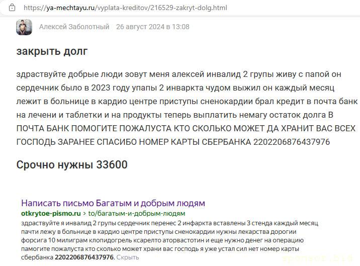 так кто там из вас с отцом сердечник?zabolotnyy.aleksey: 02 сен 2024, 21:05 здраствуйте помогите пожалуста купить лекарства ксарелто 2.5 милиг фарсига клапидогрель. номер карты сбербанка 2202206876437976