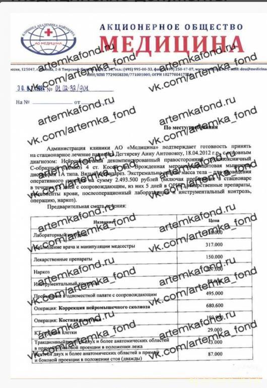 Помогите пожалуйста кто может если не финансово, то поделитесь пожалуйста ссылкой. Моей дочери Ане Дегтяревой 12лет срочно требуется операция на позвоночнике. Согласился открыть сбор благотворительный фонд Артемка. Сумма очень большая 2500000р собрали только 380тыс. Операция нужна очень срочно. Фонд сам оплачивает счёт в клинику. Фонд проверенный. Также проверяли и все документы у меня. Помогите нам пожалуйста зайдите на их сайт благотворительный фонд Артемка Аня Дегтярёва, там всё подробно описано и как помочь. Ссылки к сожалению нельзя здесь размещать.