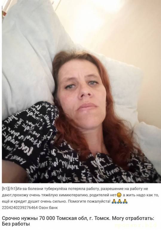 Здравствуйте! Меня зовут Евгения! Мне 39 лет. Помогите добрые пожалуйста люди, кто сколько сможет. Заболела туберкулёзом, прохожу тяжёлую процедуру химиотерапии, нужны срочно деньги в размере 70 000т.р на дальнейшие лечение, и восстановление. У меня родителей нет, родственники отказались после диагноза, не общаются. Помогите пожалуйста