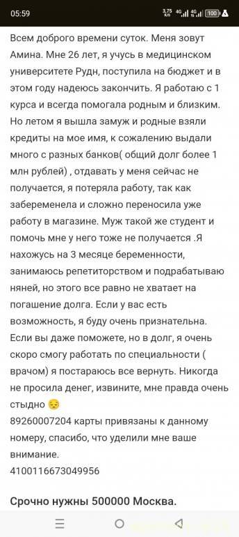Всем доброго времени суток. Меня зовут Амина. Мне 26 лет, я учусь в медицинском университете Рудн, поступила на бюджет и в этом году надеюсь закончить. Я работаю с 1 курса и всегда помогала родным и близким. Но летом я вышла замуж и родные взяли кредиты на мое имя, к сожалению выдали много с разных банков( общий долг более 1 млн рублей) , отдавать у меня сейчас не получается, я потеряла работу, так как забеременела и сложно переносила уже работу в магазине. Муж такой же студент и помочь мне у него тоже не получается .Я нахожусь на 3 месяце беременности, занимаюсь репетиторством и подрабатываю няней, но этого все равно не хватает на погашение долга. Если у вас есть возможность, я буду очень признательна. Если вы даже поможете, но в долг, я очень скоро смогу работать по специальности ( врачом) я постараюсь все вернуть. Никогда не просила денег, извините, мне правда очень стыдно