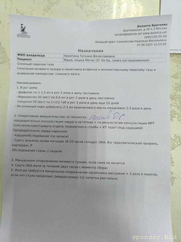А при чем здесь Кипр?)Brazilian: 11 авг 2025, 00:39 Добрый день, меня зовут Алексей, мы нашли на работе кошку у которой сломан таз. Мы отвезли ее на рентген там нам сказали что кошке требуется операция остеозинтез. Кошка плохо ходит в туалет. Есть и пьет вроде хорошо. Сейчас кошка в стационаре под наблюдением. Кошке срочно нужна операция, но для начала надо сдать все анализы и пройти обследования. Все необходимые документы я приложу если надо могу прислать видео кошки на WhatsApp. Кошка пытается ходить и вставать но ей очень тяжело. На операцию надо 30-50 тысяч рублей + реабилитация. Мы собрали 20 тысяч, но много денег ушло на осмотры, рентген, лекарства и стационар. Не знаю где просить помощи. Писал в фонды, но там тоже не густо ( свои хватает животных ). Будем признательны любой помощи. Заранее спасибо!!! Более подробно в WhatsApp.