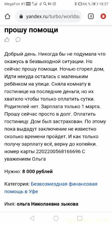 Какая сумма, каковы гарантии возврата?Ольга Николаевна: 27 фев 2021, 18:19 Прошу помощи срочно нужно заплатить за квартиру а зарплата только 17 числа. Хозяйка не идёт на встречу. Пожалуйста помогите 2202200568166696
