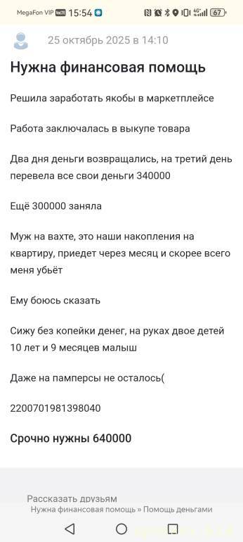 вы предлагаете абсолютно непричастным людям оплатить вашу глупость и жадность?Елена Хурамшина: 25 окт 2025, 14:48 Решила заработать якобы в маркетплейсе