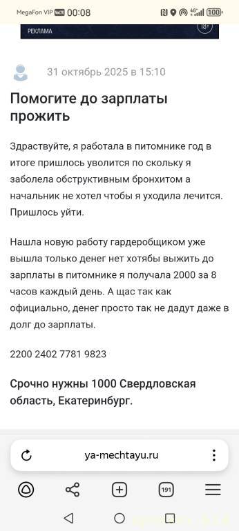 Вообще-то больничный даёт доктор без согласия начальника больного. Какая-то у вас странная история.stacy134: 31 окт 2025, 15:25 Здраствуйте помогите до зарплаты я уволилась с работы и за начальника который не хотел отправить меня на больничный в итоге пришлось уйти. Здоровье важнее. Щас устроилась в новом месте но до зарплаты как до Китая прошу кому не жалко хотябы 1000