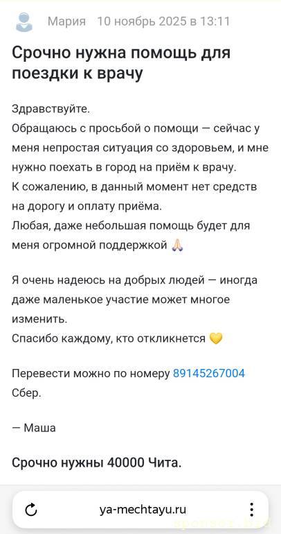 Вы к платному врачу собираетесь? А почему не по ОМС?Мария125: 10 ноя 2025, 13:35 Здравствуйте. Обращаюсь с просьбой о помощи — сейчас у меня непростая ситуация со здоровьем, и требуется консультация врача, но, к сожалению, нет возможности оплатить приём и дорогу.