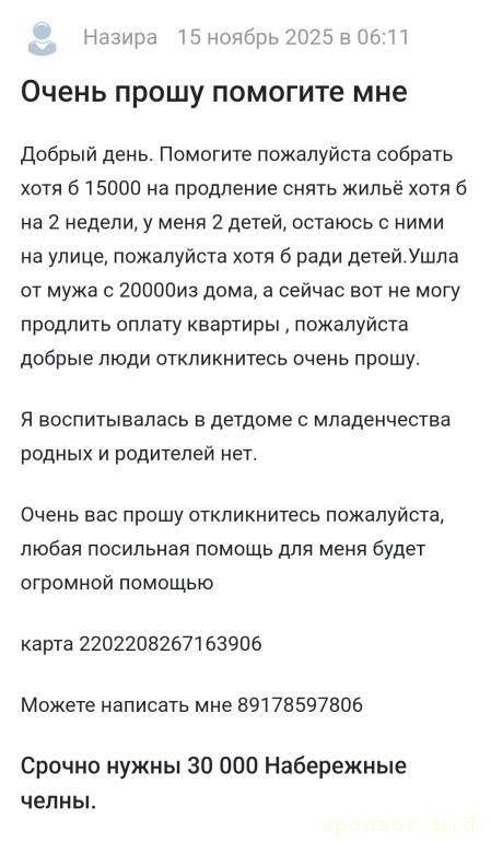 "Ушла от мужа", но мужа нет?Назира: 15 ноя 2025, 11:54 Добрый день. Помогите пожалуйста собрать хотя б 15000 на продление снять жильё хотя б на 2 недели, у меня 2 детей, остаюсь с ними на улице, пожалуйста хотя б ради детей.Ушла от мужа с 20000из дома, а сейчас вот не могу продлить оплату квартиры , пожалуйста добрые люди откликнитесь очень прошу.