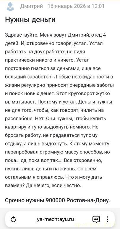 Вы хотите получить 40 миллионов в подарок, чтобы вы могли "выдохнуть"?giuster123: 16 янв 2026, 12:15 Здравствуйте. Меня зовут Дмитрий, отец 4 детей. И, откровенно говоря, устал. Устал работать на двух работах, не видя практически никого и ничего. Устал постоянно гнаться за деньгами, ища все больший заработок. Любые неожиданности в жизни регулярно приносят очередные заботы и поиск новых денег. Этот круговорот жутко выматывает. Поэтому и устал. Деньги нужны не для того, чтобы, как говорят, чилить на расслабоне. Нет. Они нужны, чтобы купить квартиру и тупо выдохнуть немного. Не бросать работу, не предаваться тупому отдыху, а лишь выдохнуть. К этому моменту перепробовал огромную массу способов, но пока… да, пока вот так…. Все откровенно, нужны лишь деньги на жизнь. И это 40 000 000 рублей. Со всем остальным я справлюсь. Что я могу дать взамен? Да нечего, если честно. Это уже шаг отчаяния. Карточка: 2204310192367525.