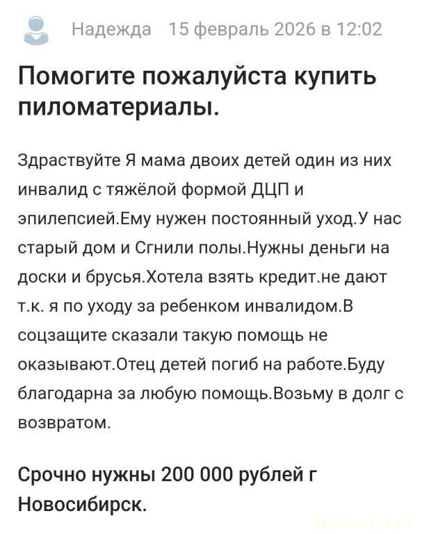 А папы двоих детей почему не принимают участие? Может они помогут?Nad: 15 фев 2026, 12:18 Здраствуйте.Я оказалась в сложной жизненной ситуаци.Я мама двоих детей.Сын инвалид с ДЦП и эпилепсией.Я нахожусь по уходу за ребенком инвалидом.Живу в селе в старом доме который смогла купить на мат капитал Сгнили полы нужно срочно менять.Сына переместила в зал так как в его комнате полы Сгнили полностью.Зимой холодно.Самостоятельно не справляюсь.Обращалась в соц защиту.Сказали такую помощь не оказывают.Мне нужны пиломатериалы или деньги на них.Хотела взять кредит. Но не дают из за того что по уходу за инвалидом.Буду благодарна за любую помощь и подсказку как выйти из ситуации.