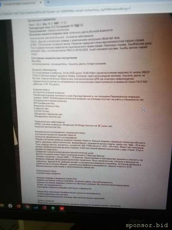 Вы сумму безвозмездно просите?Ната1987: 31 мар 2026, 17:16 Я мать-одиночка. Прошу помощи спонсоров. Моего единственного сына 24 марта 2025 года избили жестоко. На момент обращения в СМП были диагностированы повреждения: ЗЧМТ, ушибленная рана носогубного треугольника справа с гемосинусом, перелом правой пазухи носа, перелом верхнечелюстной пазухи справа. Возбуждено уголовное дело по факту избиения моего ребенка. На данный момент мне нужно 300000 руб для доведения дела до суда: нужно провести ещё экспертизы и лечение. Обидчики не наказаны и не выплачена материальная помощь.