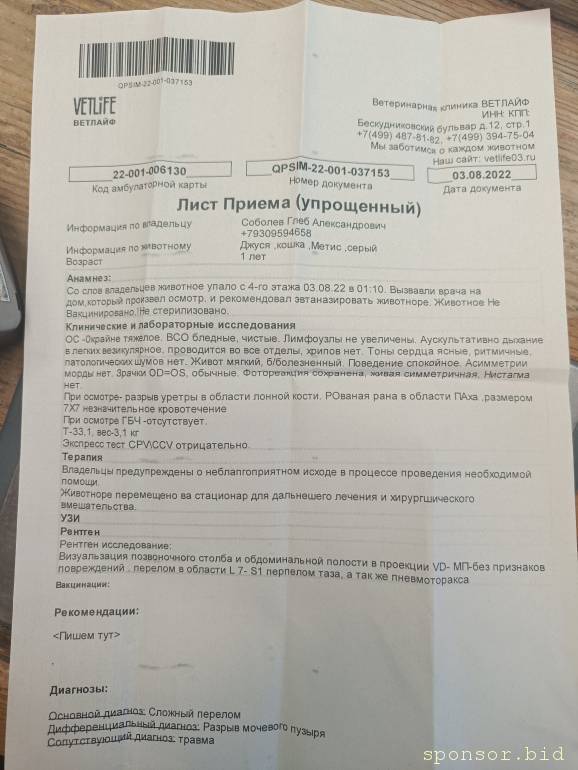 Смету лечения на 100т выложитеТатьяна0994: 03 авг 2022, 08:15 Прошу помощи. Кошка упала с балкона ....В очень тяжёлом состоянии....разрыв уретры в области лонной кости , рваная рана в области паха размером 7*7,кровотечение ...перелом таза и пневмоторакса ... Кошка в очень тяжёлом состоянии, низкая температура и давление ..сейчас находиться в клинике ветлайф (Москва), нужно минимум три операции ... По деньгам сказали около 100тыс , нам не хватает 25 тысяч.... Буду благодарна каждому рублю ....Помогите спасти члена семьи ....