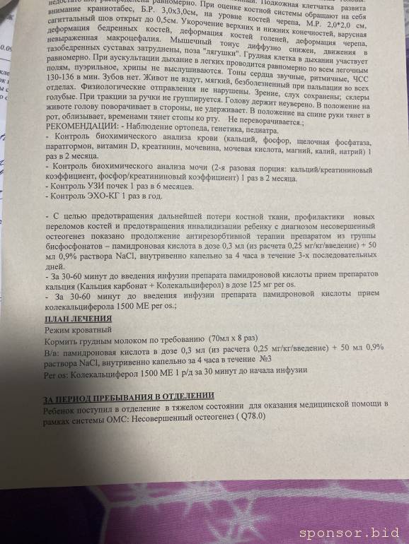 С Варечкой мы проходим лечение в Москве и каждые 2 месяца ездим на капельницы бисфосфонатов в НЦЗД. Уже были три раза , есть значительные улучшения, Варечка перестала ломаться. Следующая капельница по плану в ноябре , но капать нас смогут только платно , также как и реабилитировать. Выставили счёт в 231345 руб