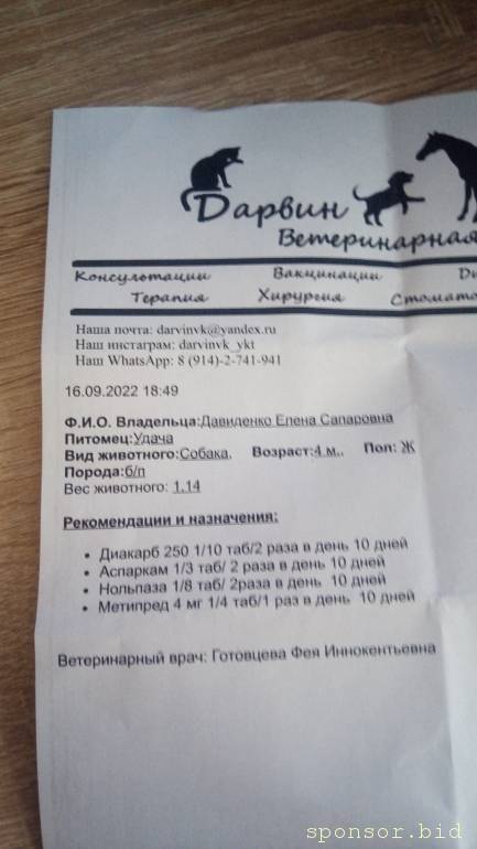 В любом случае работать на лечение собаки будут её хозяева, а не посторонние люди.Дарья Рякова: 17 сен 2022, 08:58 Поменяла фотографии. Повторяю от того, что она больна, её сбагрили, а не продали!