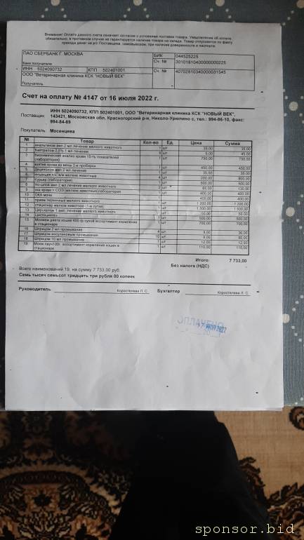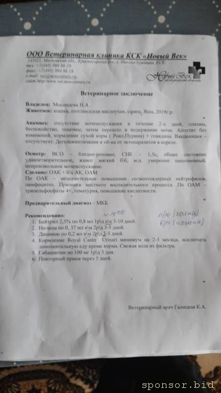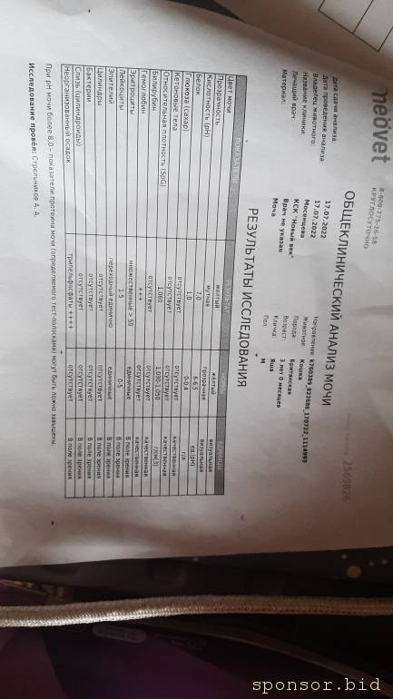 Здравствуйте уважаемые форумчане, у меня есть кот Яша, ему в сентябре будет 3 года, но скорее всего он до него не доживет. В июле сего года мы его лечили от МКБ, но вчера был врач и сказал что курс лечения был назначен не правильный. Песок сохранился, показатели Ph и белка завышены, посчитал стоимость катетеризации, промывания мочевого, стационар и лекарства выходит 15000, помогите пожалуйста. Документы июльских обследований прилагаются, на документах имя моей матери. Моча у котика не выходит уже второй день, ест мало на вид слабенький, вялый. Номер карты 4276_5220_1321_8898 владелец Николай Васильевич К.