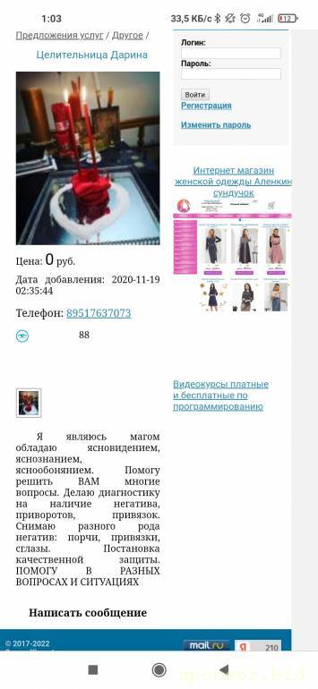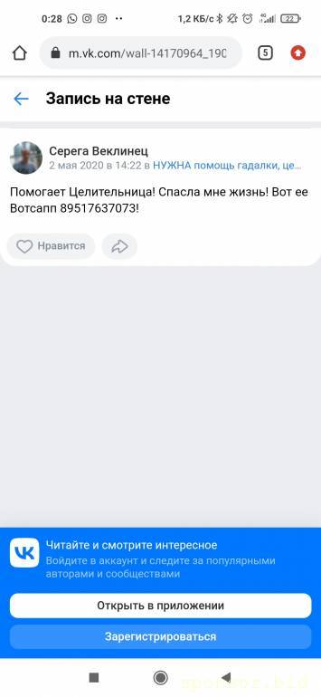 про рекламу целительницы объяснить можете? откуда эти объявления с вашим номером и страницей-однофамильцем? все ваши номера я здесь собрал, форум отлично индексирует я в поисковиках, так что чёс в ВК теперь тоже будет немного затрудненДарья3456: 29 сен 2022, 01:05 У вас все хорошо с головой ? Я ещё раз повторюсь все документы имеются на собаку