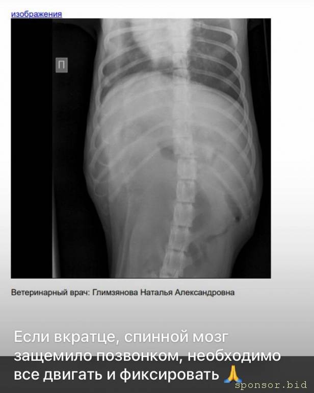 Поврежден позвоночник, раздроблена лапка.