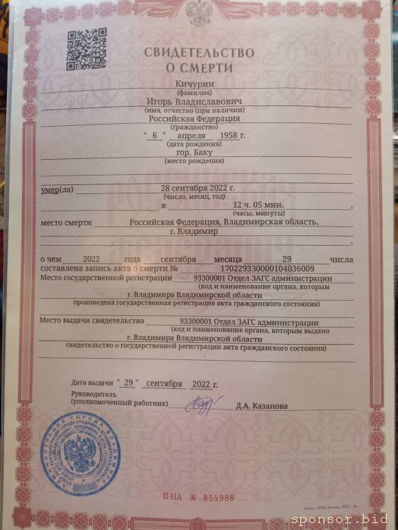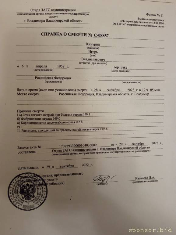 Прошу вас уважительно отнестись к моей просьбе. Мой муж Игорь Владиславович, 06.04.1958 г.р , умер 28.09.2022 г.