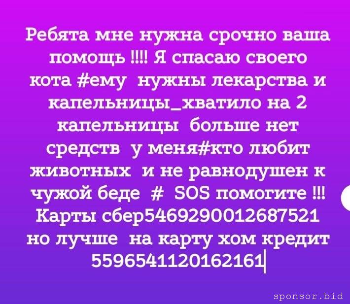 Нужны деньги на капельницы коту срочно карта сбер5469290012687521 оплатила сколько было а больше нету почки но это не точьно оплатили анализы сегодня не смогли поехать нету денег капельницу не ставили он не ест и не пьет и у него диабед постоянно на инсулине