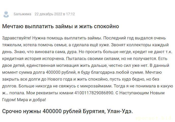 Здравствуйте! Я мама в декрете, так сложилось, что я попала трудную жизненную ситуацию. Не хватало денег на еду и я по своей глупости связалась с МФО, брала новые, чтобы перекрыть действующие, сейчас на данный момент долг перед МФО составляет 400000 рублей. Для меня это огроооомные деньги. До сегодняшнего дня я пыталась продлевать, переносить дату платежа, а сейчас нет денег даже на молоко. Звонят коллекторы каждый день, родственникам всем должна отдать до конца декабря. Я молю Вас, люди помогите мне. Я практически перестала есть( мой вес сейчас 36 кг), спать. Уже были мысли о суециде, но мои дети больше ни кому не нужны.