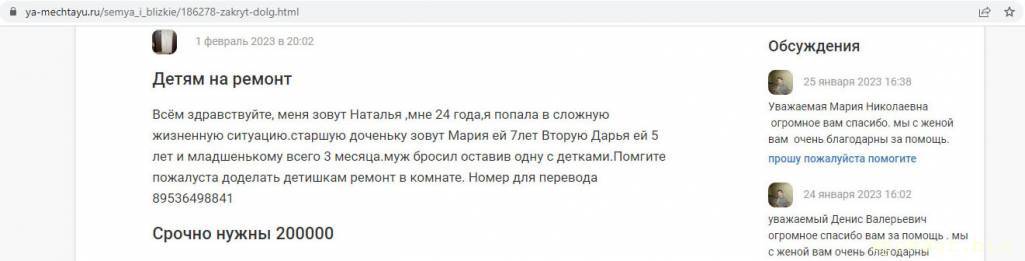Вот здесь написали, пару часов назад - https://ya-mechtayu.ru/semya_i_blizkie/ ... -dolg.htmlНаталья98: 01 фев 2023, 23:12 Здравствуйте,а я что написала что мне нужно 200000 тысяч,??муж у меня забрал 50 этого мне было достаточно сделать им ремон поклеить обой и выделить рабочее и спальное место.я действительно ищю помощь а не издёвки со стороны мне сейчас и так тяжело