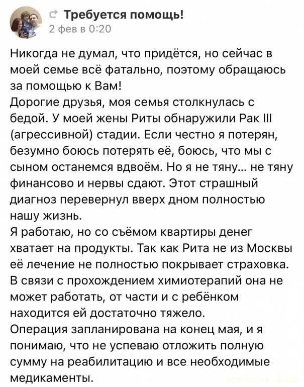ну не так уж и давно, ещё в феврале "деньги на лечение" вам собирал, а теперь вы сами собираете, но уже на долги и кредиты