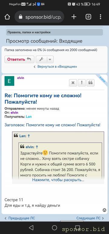 мошейники не просто номер телефона позаимствовали, но даже стиль письмаelvin: 12 июл 2023, 16:44 Здраствуйте Помогите пожалуйста, если не сложно... Хочу взять сестре собачку Корги и нужно к общей сумме всего 6 500 рублей. Собачка стоит 36 200. Пожалуйста, я много просить не люблю! Помогите с суммой.