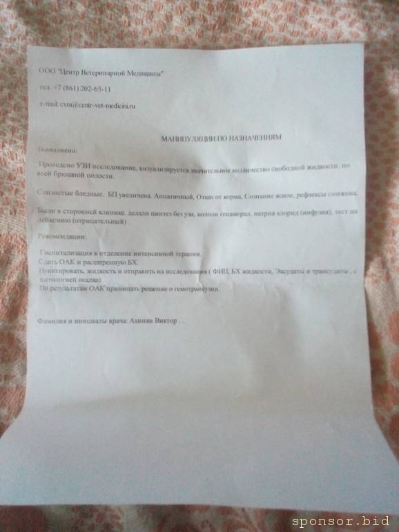 В моём окружении знают ситуацию с котиками. Я живу в небольшом городке сельского типа, где дефицита в кошках нет. В этой местности у людей такие взгляды, что проще убить больное животное, чем тратить деньги на лечение. так лучший друг семьи без проблем возит меня в ветеринарную клинику, в замен я колю уколы его псу (по назначению), но когда он узнал, что я оставила 2000 рублей за стерилизацию кошки, то сказал - проще потопить котят. у меня родители всегда так делают. Волонтёров в нашем городе мало. Я знаю всего 3-х человек. И все мы тратим последние средства на помощь животным. Покормить бездомную собаку\кошку, отвезти на стерилизацию. девочки помогли мне с операцией Рысика, сейчас стараются помочь с химиотерапией. но у них и свои подопечные есть. на форум я написала от безысходности. я не говорю, что должны помочь именно мне и моим котикам. дай то бог, чтоб вообще помогли кому-нибудь. я посмотрела посты, тут у авторов много проблем. и с ФИПом не только у меня питомец. насчёт группы в ВК, я всё никак не могу сделать хотя бы страничку с инфой о своих подопечных. Сейчас общаюсь с вами, а мой работодатель прислал новое задание на написание текстов. я понимаю, что работа важнее, ведь это деньги для семьи и питомцев. Но не могу не ответить вам. Не потому, что хочу поскандалить, я хочу понять как вообще устроен ваш форум. Возможно и сама смогу кому-то помочь через время. Моя ситуация не навсегда. Это проблема, которая разрешится. А тут есть другие люди с такими же проблемами. Вы говорите, что тут много лжи в историях. но разве можно врать о таком. говорить, что ваш питомец тяжело болен, когда он здоров и весел? Так же и накликать можно. не знаю, насколько вам покажутся достаточными доказательства. Я прикрепила фото документа и частной клиники, где коту узи сделали и расписали рекомендации для стационара. В нашем городе такого нет, повезу в Краснодар. Это главный город нашего региона. И предпоследний протокол оказания помощи из нашей муниципальной ветлечебницы, где мы долгое время проходили лечение по неправильному диагнозу. За что ругаю себя сильно. Я не ветеринар, но некоторый опыт и знания в этой области есть. Колы в мышцу и подкожно делаю сама. могла бы заменить антибиотик или другое противовирусное колоть. у нас же на 7 бед один ответ и одна схема лечения - фелифирон, гамавит, цефтриаксон (иногда фармазин). извините, что загрузила. Просто реально в ближайшем окружении не с кем обсудить такие проблемы. До свидания.