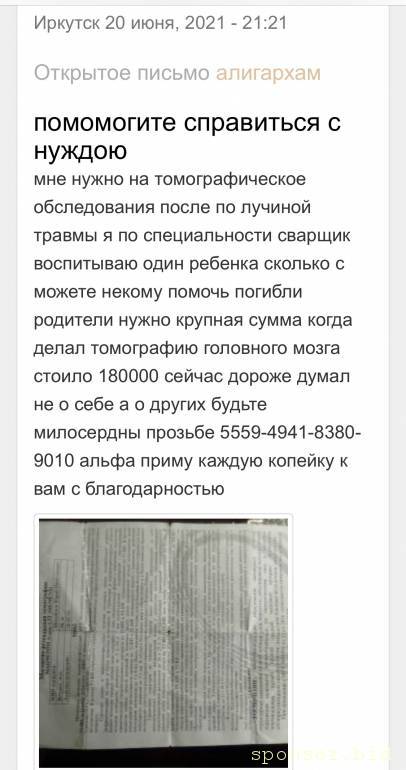 Доя историиyurawelder: 19 авг 2023, 19:13 Я безработный до пенсии 2 годо проживаю в маленьком посёлке сын стал инвалидом 2 группы после ковита на лекарства уходит еженедельно много денег пенсия 11 тысяч появились долги большим за жилье помогите капейкой. Есле нужно могу предоставить документы надеюсь на ваше милосердие люди Альфа-банк 5559-4941-8380-9010