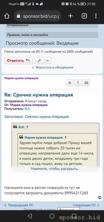 Мария нужна операция, операция платно или по омс?Мария нужна операция: 17 сен 2023, 20:35 Здравствуйте люди добрые! Прошу вашей помощи нужно собрать 20 тысяч на операцию, направление дали еще 14 числа, я мама двоих деток, младшему три года только в сад пошел, живу на детские, собиралась устроится на работу и тут приступ случился, напишите в ватсап кому не все равно 89954211265 документы все предоставлю в доказательство своих слов, номер карты 2200270470590772 прошу не проходите мимо!!!