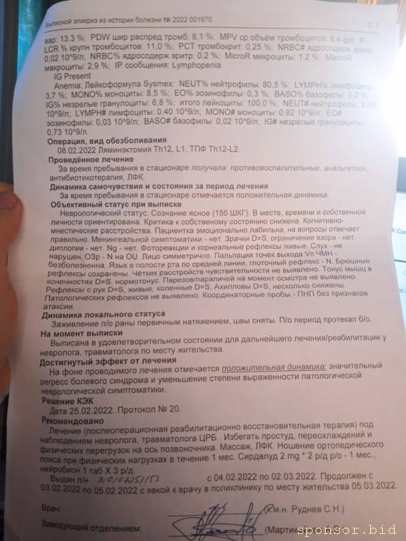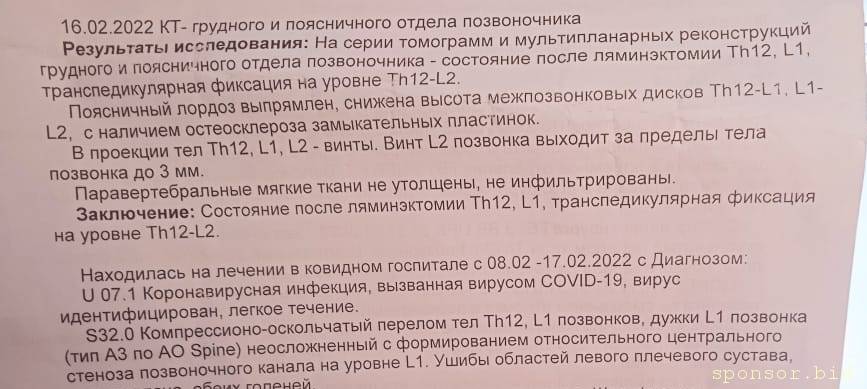 Не нашла про позвоночник, если честноАлена С.: 29 сен 2023, 14:24 Имею инвалидность, сломан позвоночник L1,Th12,гиперемия,частичная атрофия желудка, воспаление толстой кишки, нужны деньги на реабилитацию и лечение, на оплату ЖКХ 180 000, и за кредиты 300 000..Прошу помочь, кто чем сможет...По номеру карты Альфа банка: 2200150968365400