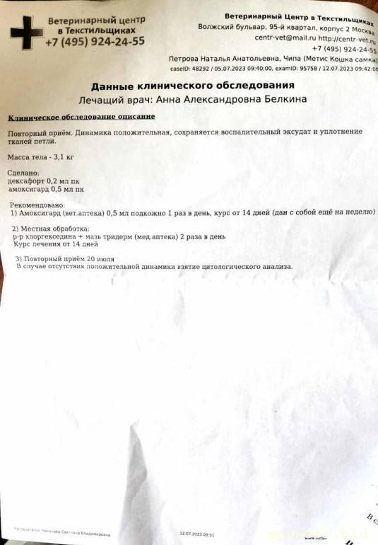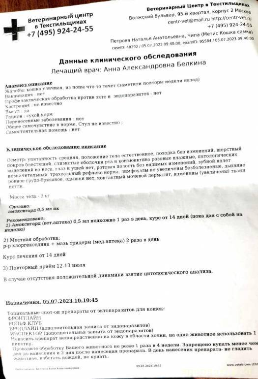 > Первое посещение после того как заметили, что у кошечки проблемы. Носила в ветеринарную клинику коллега, имя дала Чипа